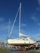 Sand blasting Dehler 36 JV bottom and rebuilding the anti fouling paint system.